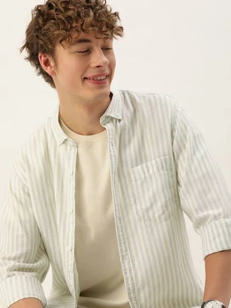 White and Green vertical stripes striped opaque Casual shirt ,has a button-down collar, button placket, 1 patch pocket, long regular sleeves, curved hem